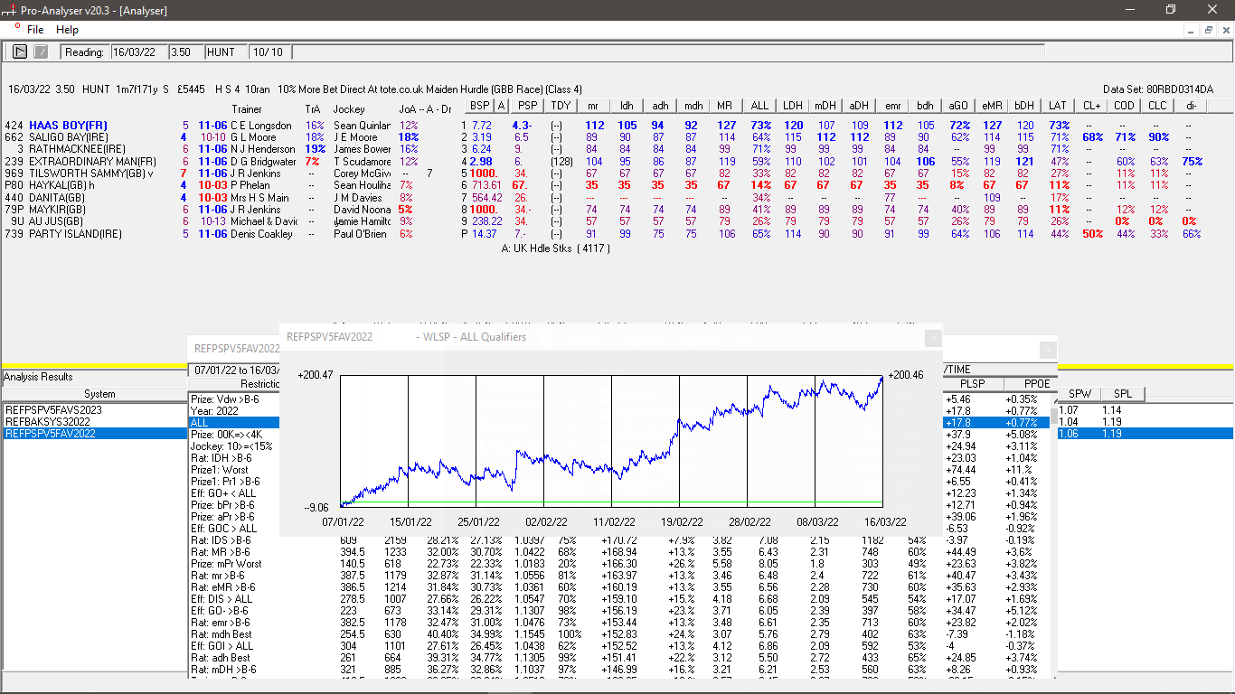 Tests your theories on over 20 years racing results and 4 staking plans, Back or Lay, @ Industry SP or Betfair SP.